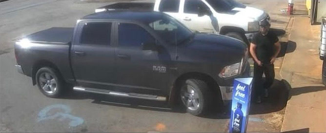 Police say the individual wore a black T-shirt, black hat, dark-colored pants, and gray “Hey Dude” style shoes at the time of the incident. The images show the man inside a convenience store and outside near a pickup truck.